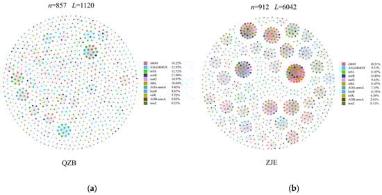Modular constructions of the key functional gene networks in the soil: (a) Quanzhou Bay mangrove forest (QZB), (b) the Zhangjiang Estuary mangrove forest (ZJE).