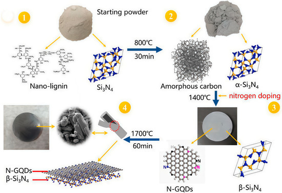 - Chen, W.; Xu, E.; Liu, X.; Zhang, Y.; Wang, H.; Li, Q.; Zhou, M. Study on a Novel Si3N4-Based Composite with the Incorporation of N-GQDs Produced from Nano-Lignin. Ceram. Int. 2024, 50, 19534–19542. [Google Scholar] [CrossRef]
