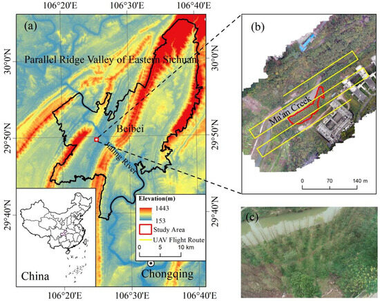 As indicated in Figure 1a, the study area (106°24′56.42″–106°24′59.89″ E and 29°49′31.01″–29°49′34.08″ N) is situated in Ma’anxi Wetland Park of Beibei district, Chongqing, China. Beibei district lies in the parallel ridge valley of eastern Sichuan Basin. The park starts from the Longtanzi Reservoir and ends alongside the Jialing River. It has an elevation range from 57 m to 168 m above sea level (Figure 1b) and an area of approximately 0.73 km2. The local humid subtropical climate is mainly influenced by the monsoon current from Southeast Asia. With this, the annual mean temperature is 18.3 °C, and the mean yearly rainfall is 1105.4 mm.