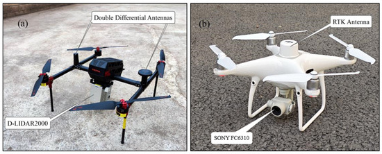 Figure 2. UAV Systems. (a) Feima D2000 with D-LIDAR2000; (b) DJI Phantom 4 RTK with SONY FC6310 (Sony Corporation, Tokyo, Japan).