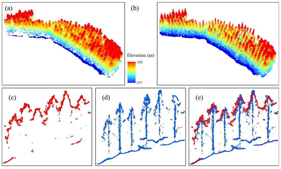 The two laser scanning tasks were carried out on 14 July 2021 (the summer, leaf-on) and 28 December 2021 (the winter, leaf-off). In both flights, the drone followed the same routes and adopted the same settings. The flight altitude was 90 m, the side overlap was 50%, and flight speed was 5 m/s. The weather were sunny for the two days, with almost no wind. The resulting point clouds of the two seasons were shown in Figure 3a,b. The average density of the two point clouds was approximately 1260 points/m2. The partial profiles of the two point cloud were indicated in Figure 3c,d, and their combined result was in Figure 3e.