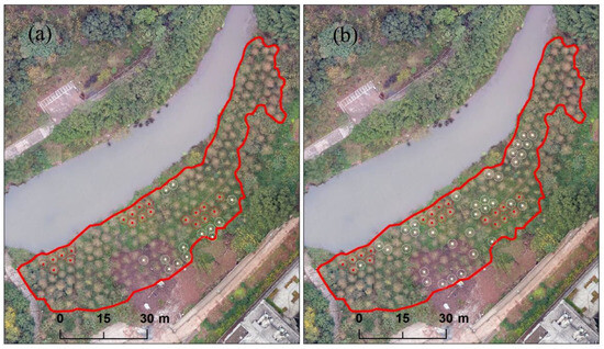 Figure 4. (a) Locations of the trees whose heights were measured on 14 July 2021; (b) locations of the trees whose heights were measured on 28 December 2021. The red points denote tree locations where height measurements were performed in both summer and winter.