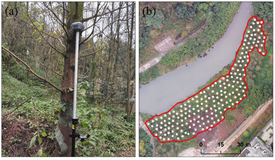 Figure 5. (a) RTK GNSS; (b) spatial distribution of all the trees in the study area.
