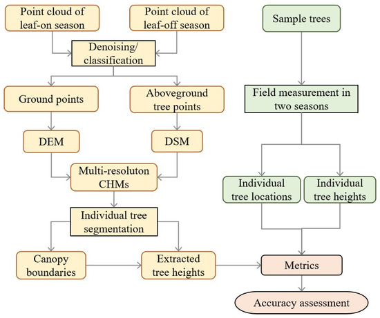 Figure 6. The workflow for studying seasonal impacts on individual tree detection and height extraction using UAV-LiDAR.