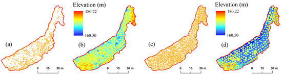 Figure 7. (a) The ground points in the summer; (b) the vegetation points (displayed via height) in the summer; (c) the ground points in the winter; (d) the vegetation points in the winter.