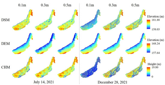 Figure 8. DSMs, DEMs, and CHMs of the two seasons with different spatial resolutions.