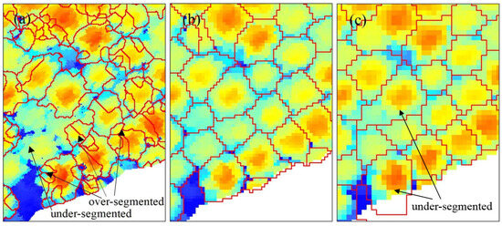 Figure 9. Illustration of the segmented canopies from CHM with various spatial resolutions. (a) 0.1 m; (b) 0.3 m; (c) 0.5 m.