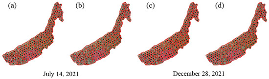 Figure 10. Segmented canopy boundaries and detected apexes from the two season CHMs with different resolutions. (a) The result of 0.3 m in the summer; (b) the result of 0.5 m in the summer; (c) the result of 0.3 m in the winter; (d) the result of 0.5 m in the winter.