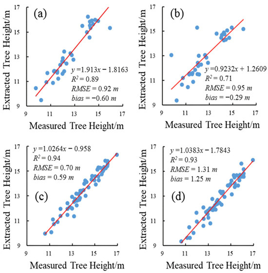 Figure 11. Correlations of measured and extracted individual tree heights. (a) 0.3 m summer CHM; (b) 0.5 m summer CHM; (c) 0.3 m winter CHM; (d) 0.5 m winter CHM.