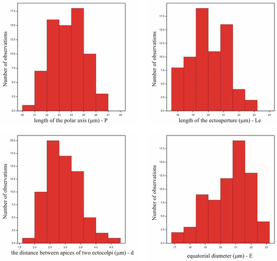 Table 1. Mean values and standard deviations, values of the F test statistic from the analysis of variance, as well as results of the Shapiro–Wilk W-test for normality and Bartlett test for the length of the polar axis (P), length of the ectoaperture (Le), the distance between apices of two ectocolpi (d), and equatorial diameter (E).
