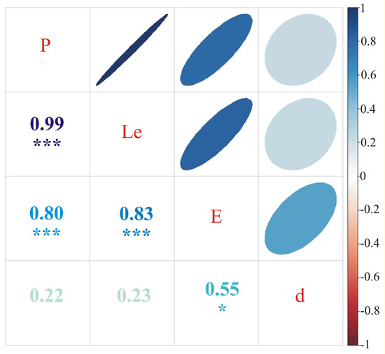 An almost perfect correlation was observed between the length of the polar axis (P) and the length of the ectoaperture (Le), with a Pearson correlation coefficient of 0.99 (Figure 2). Statistically significant correlations were also found between P and equatorial diameter (E) (r = 0.80), Le and E (r = 0.83), as well as between E and the distance between the apices of two ectocolpi (d) (r = 0.55) (Figure 2). Only two correlation coefficients were not statistically significant: those between P and d (r = 0.22) and between Le and d (r = 0.23) (Figure 2).