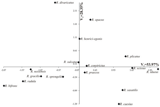 The distribution of the 16 Rubus species within the space defined by the first two canonical variates revealed a clear separation into four distinct groups. The first group comprised four species, R. bifrons, R. gracilis, R. nessensis, and R. radula, characterized by the highest values for both the length of the polar axis (P) and the length of the ectoaperture (Le). The second group included R. divaricatus, R. henrici-egonis, and R. opacus, which exhibited the lowest values across all four analyzed traits. The third group consisted of five species, R. caesius, R. idaeus, R. plicatus, R. saxatilis, and R. scissus, distinguished by the highest values for the distance between the apices of two ectocolpi (d). The fourth group comprised the remaining four species, R. constrictus, R. praecox, R. sprengelii, and R. sulcatus, which displayed intermediate (average) values for all four traits (Figure 3).