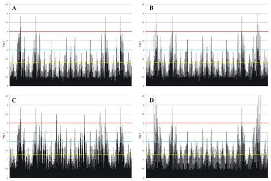 The length of the polar axis was determined by 3346 markers (Table 2, Figure 4A), and this was the trait for which the largest number of statistically significant markers were detected. The length of the ectoaperture was influenced by 3340 markers (Table 2, Figure 4B), and the distance between the apices of two ectocolpi by 3342 markers (Table 2, Figure 4C). The smallest number of markers (2882) determining the observed traits was for equatorial diameter (Table 2, Figure 4D).