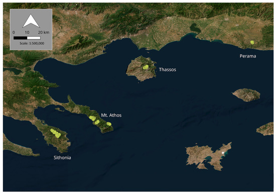 Needle samples from black pine were collected from four distinct regions in Greece: the peninsula of Athos and Sithonia (Chalkidiki), Perama (Eastern Macedonia and Thrace), and the island of Thasos. A total of 93 samples were gathered: 43 from the Athos peninsula, 20 from Psaria in Sithonia, 20 from Perama, and 10 from Maries in Thasos (Figure 1). Geographic coordinates were recorded for each sampled tree (Table S1). All samples were stored at −20 °C prior to DNA extraction. Sample nomenclature employed the initial letter of each collection region followed by a unique identifier for each individual. Only mature trees were selected, and individuals were separated by at least 50 m. Sampling was carried out extensively in Mt. Athos, which is the focal population of this study. There, individuals sampled were representative of all locations where black pines occurred. The other three populations were chosen because of their geographical proximity to Mt. Athos. In these cases, adult trees were selected randomly, again with a minimum distance of 50m from each other.