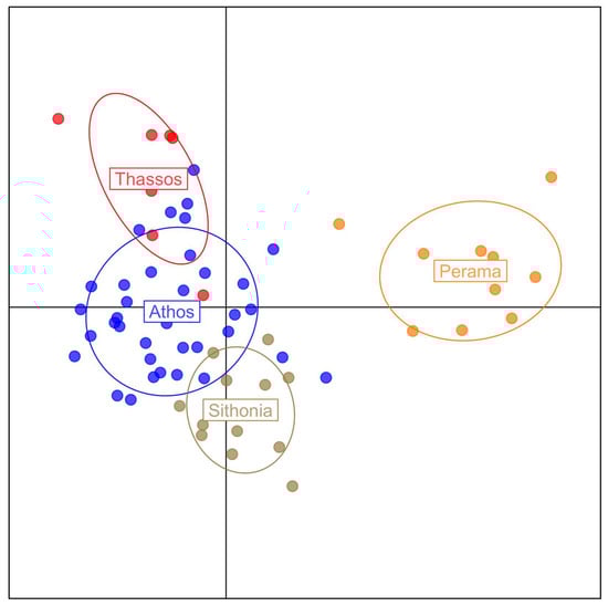 PCA (Figure 2) did not provide clear insights into the population structure. All populations seem to be genetically close, with no distinct pattern or clustering. DAPC (Figure 3) recovers weak among-population structure (FST ≈ 0.04) with a single mainland outlier, Perama, which diverges sharply from the largely overlapping Mount Athos, Sithonia, and Thassos groups.