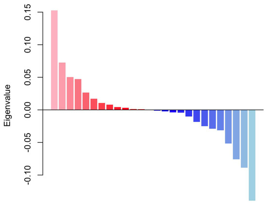 The spatial Principal Component Analysis (sPCA) reveals both broad-scale and fine-scale genetic structure within the Athos population. The eigenvalue plot (Figure 5) shows several large positive eigenvalues, indicating strong global structure—genetic similarity among geographically close individuals—while smaller negative eigenvalues point to the presence of local structure, or fine-scale genetic differentiation among neighbours. In Figure 6A, three geographically coherent genetic clusters are evident: individuals at the western tip (24.20° E, 40.25° N) exhibit negative scores, those in the central area (24.25° E, 40.20° N) show intermediate-to-positive scores, and individuals in the southeastern tip (24.35° E, 40.20° N) have uniformly high scores. This pattern suggests a clear east–west genetic cline with minimal overlap among clusters, likely driven by isolation by distance or spatially restricted gene flow. In contrast, the local structure (Figure 6B) highlights fine-scale spatial patterns: while the western and southeastern groups remain genetically homogeneous (scores ≈ 0), the central region displays sharp, metre-scale contrasts between positive (black) and negative (white) scores.