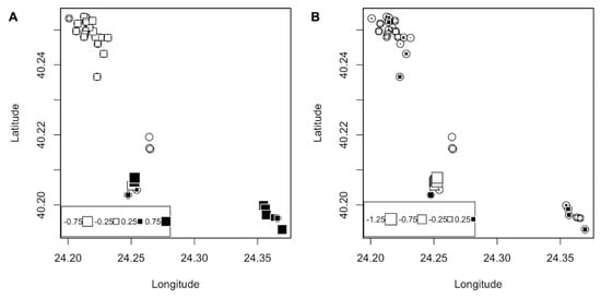 Global and local sPCA for Athos population. (A) Global component (PC1), represented by the first positive sPCA axis, and (B) local component (PC2), represented by the first negative sPCA axis.