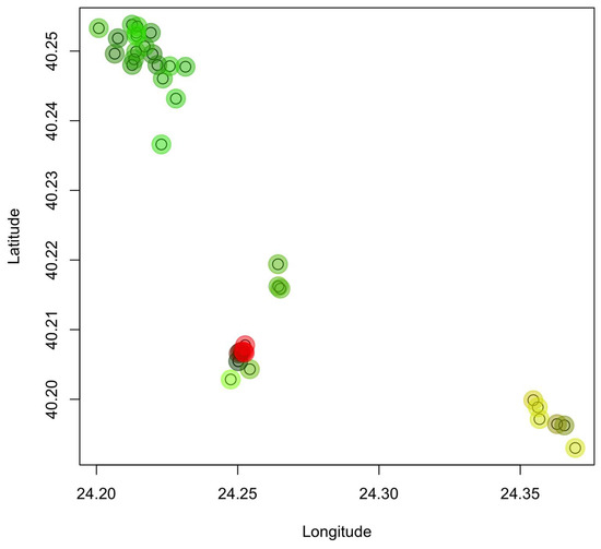 Figure 7 further illustrates this spatial genetic differentiation using a colour plot of the first two principal components based on the RGB colour system. Each point represents an individual positioned according to geographic coordinates, and the colour reflects genetic similarity: red, green, and blue intensities correspond to the first three principal components. The resulting pattern reveals three primary clusters matching those in Figure 6A—green in the northwest, red in the central region, and yellow in the southeast—supporting the presence of both broad-scale and localized genetic structure.