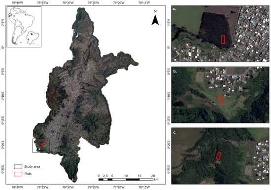 Study Area: plots in the southern Quito area with potential for urban expansion. (a) Eucalyptus plantation, (b) grassland, (c) montane forest.