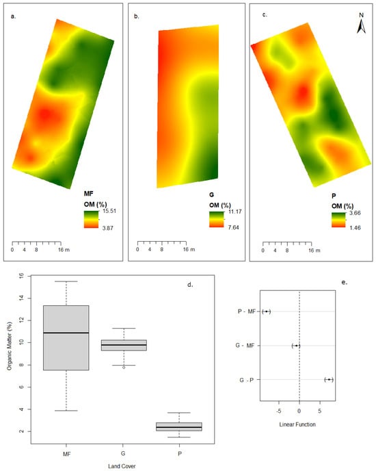 Percentage concentrations of organic matter to land cover category. Spatial distribution; (a) montane forest, (b) grassland, (c) eucalyptus plantation (d) box plot, organic matter distribution by land cover category, and (e) differences in the mean levels of the groups (95% family-wise confidence level).
