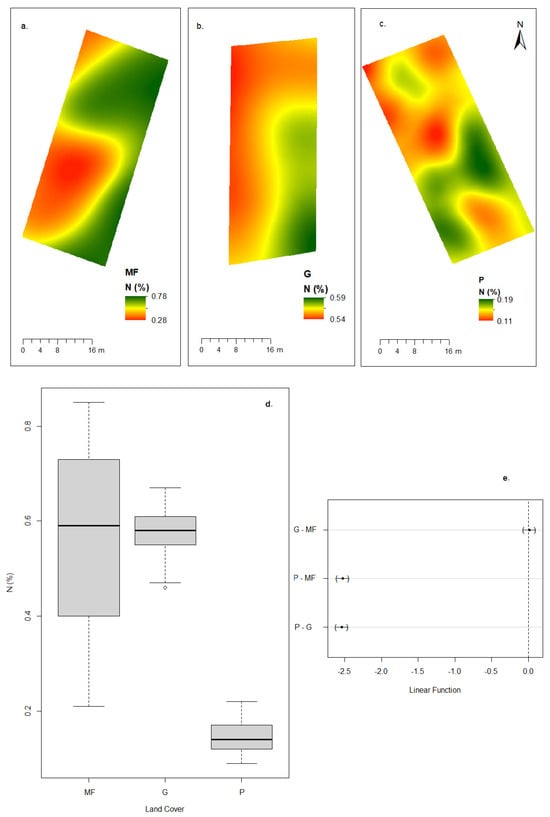 N concentrations according to cover category. Spatial distribution: (a) montane forest, (b) grassland, (c) eucalyptus plantation, (d) box plot: nitrogen data distribution by land cover category, and (e) differences in mean levels of group (95% family-wise confidence level).