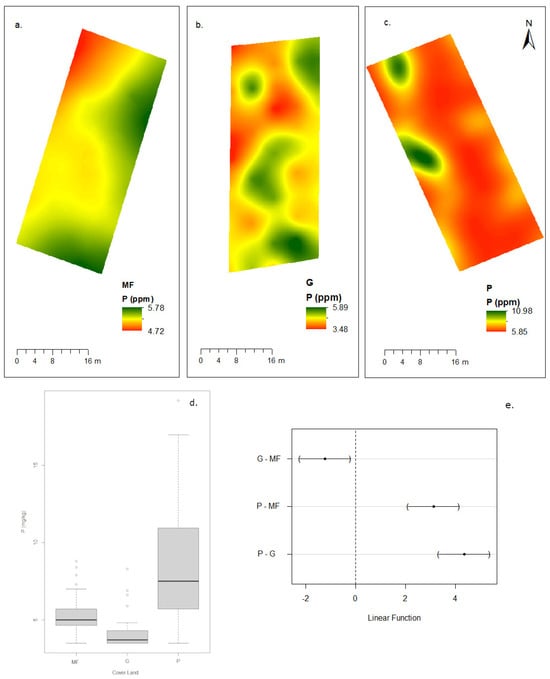 Concentrations of P by land cover category. Spatial distribution: (a) montane forest, (b) grassland, (c) eucalyptus plantation, (d) box plot: phosphorus data distribution by land cover category, and (e) differences in the mean levels of the groups (95% family confidence level).