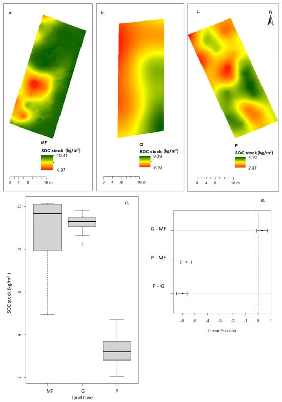Concentrations of soil organic carbon (SOC) stock by land cover category. Spatial distribution: (a) montane forest, (b) grassland, (c) eucalyptus plantation, (d) box plot: soil organic carbon stock distribution by land cover category, and (e) differences in the mean levels of the groups (95% family confidence level).