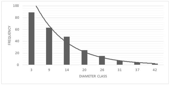 To characterize the native forest, a plant inventory of individuals with a diameter at breast height ≥ 0.10 m was conducted. From the inventory, some structural parameters of the forest were obtained (Table 2): diameter structure, taxonomic richness, plant composition, relative density, relative dominance, relative diversity of family or genus, the Shannon–Wiener index, and the Simpson index [75,76,77].