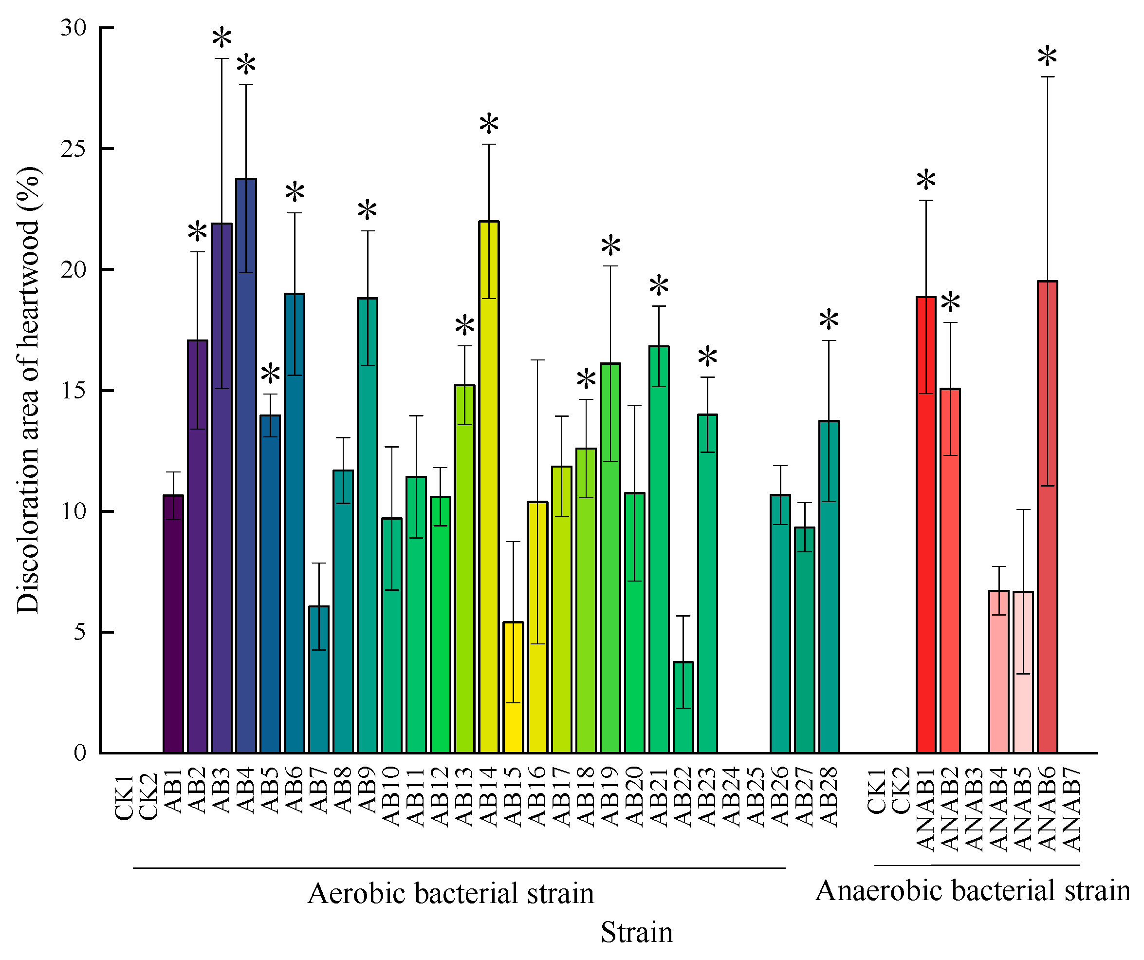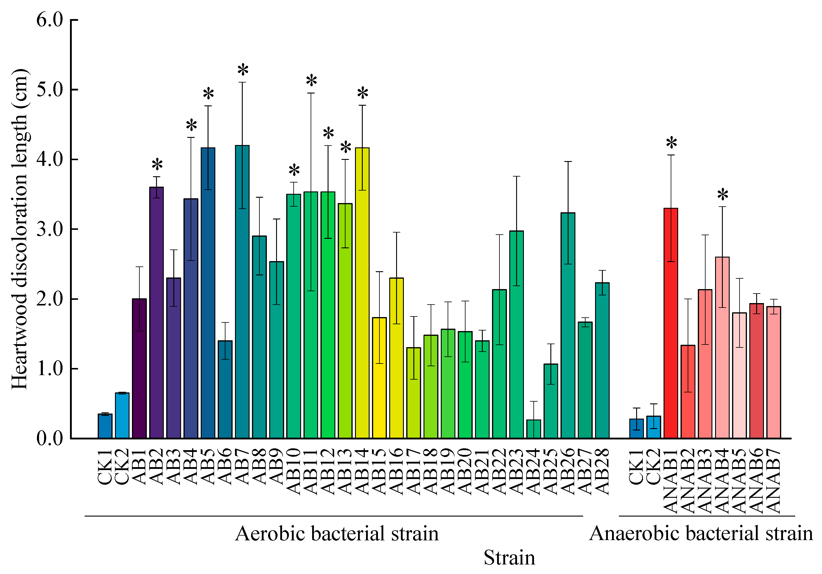 - Song, C.C.; Mei, L.; Cai, L.; Zhang, S.; Fan, X.P. Identification of pathogen bacteria and antagonistic bacteria of wet-heart wood disease in Populus. J. Southwest For. Univ. 2018, 38, 142–152. [Google Scholar]