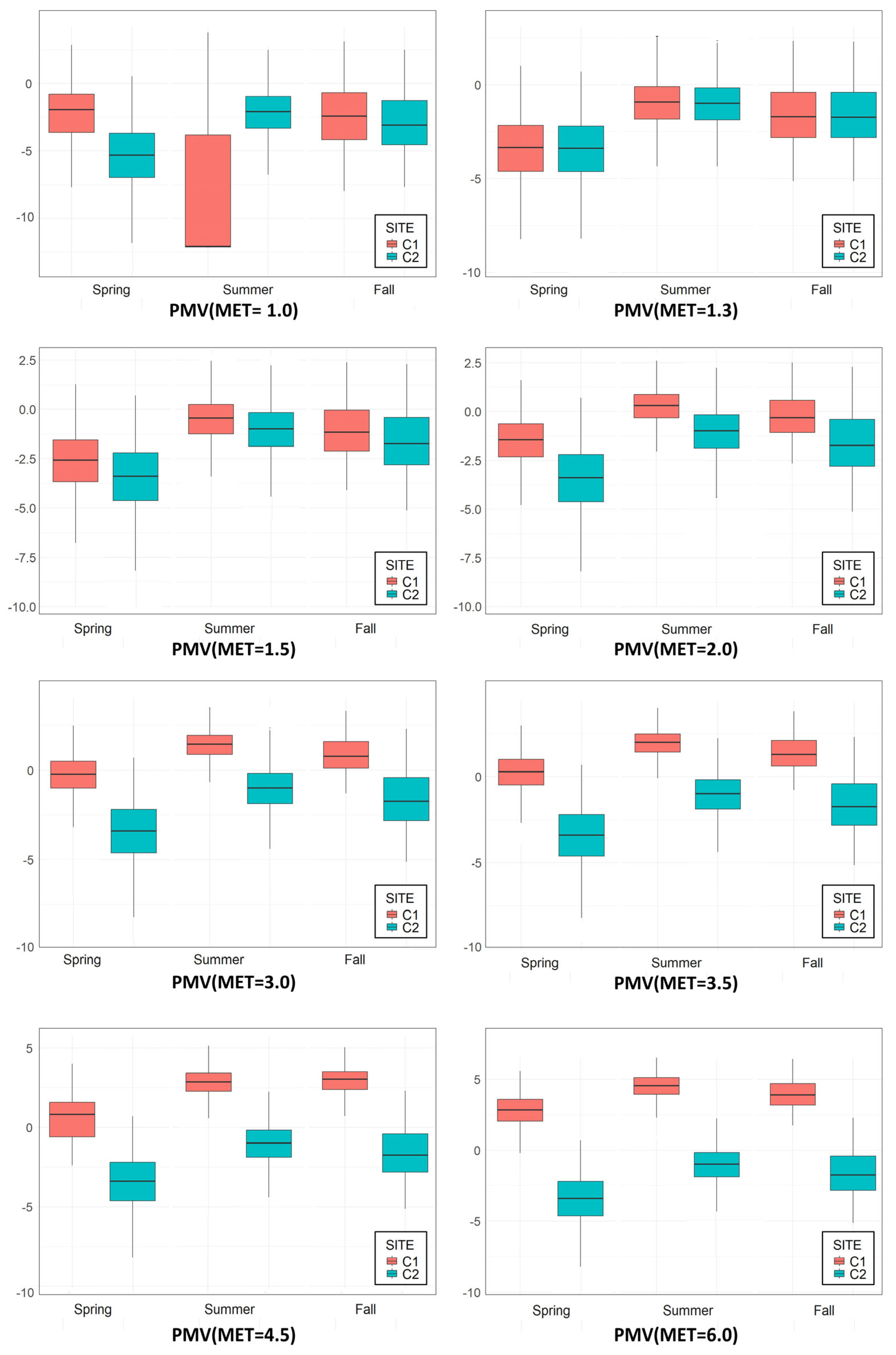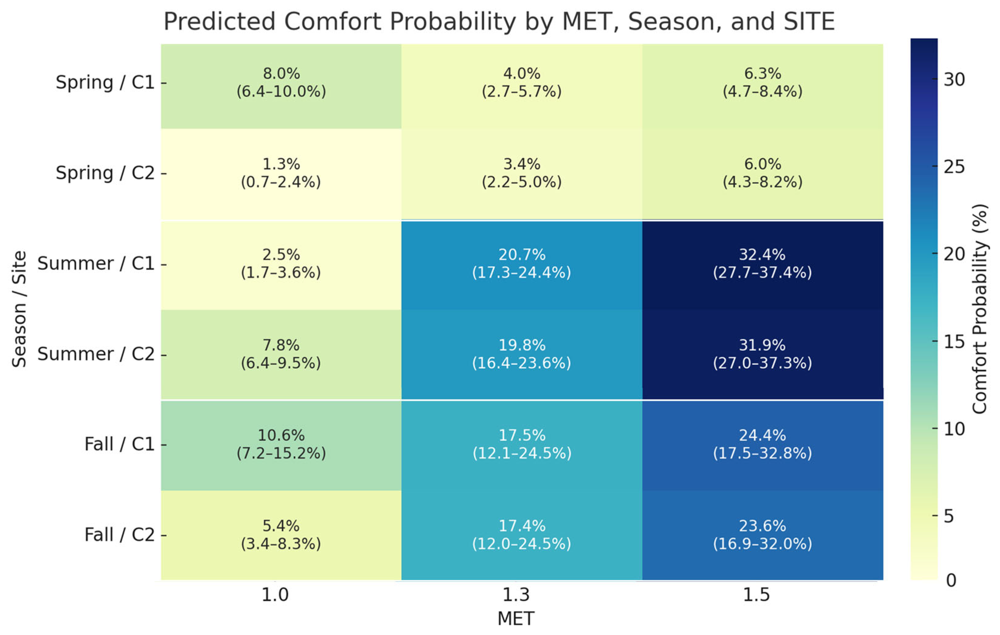 2.3.2. Modeling Interactive Effects of Season, Site, and MET on Comfort (MET 1.0–1.5)