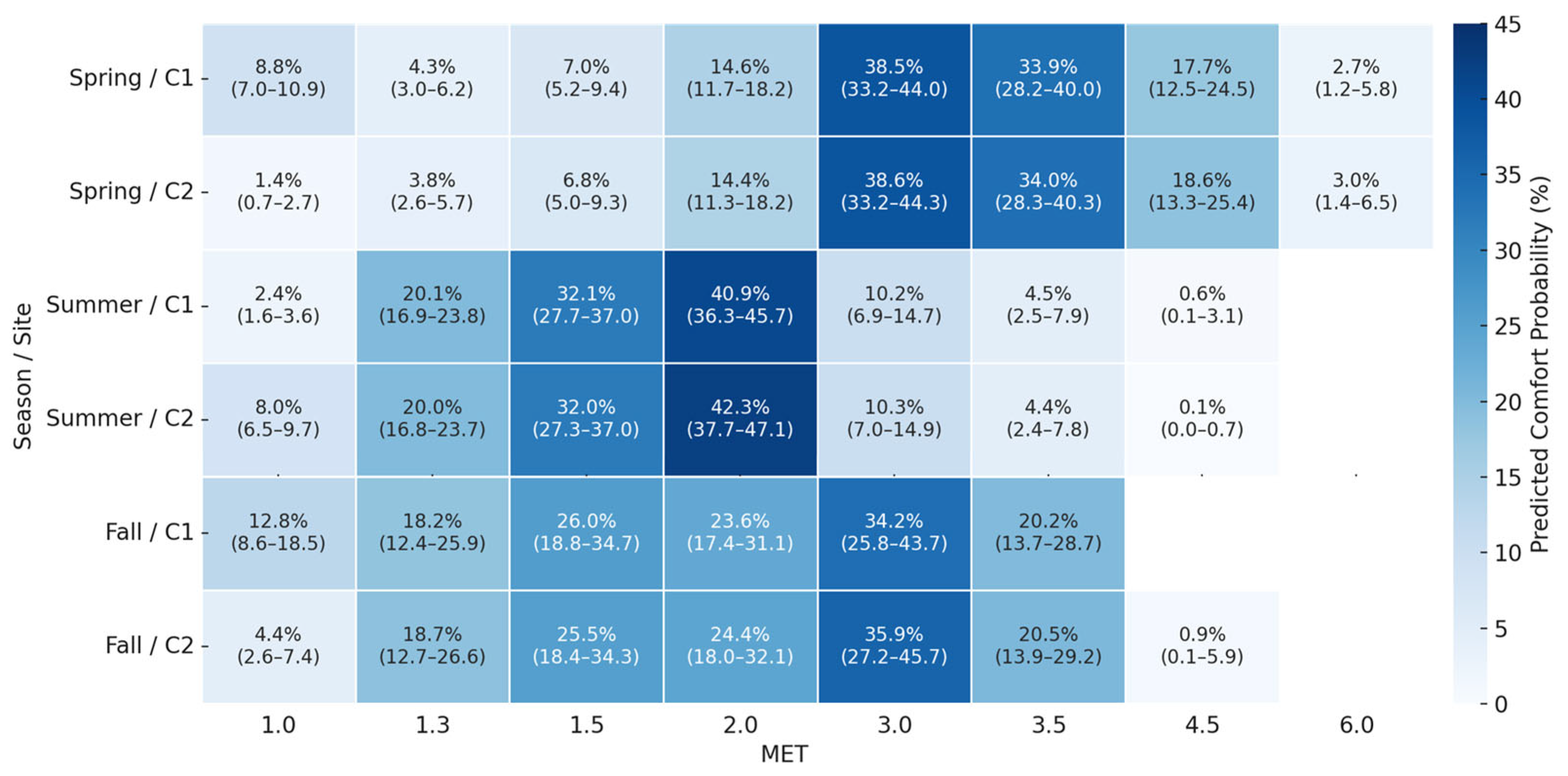 | 1.0, 1.3, 1.5 | Comfort (PMV ± 0.5) | logit | AR(1) | SITE × MET × date | Hour (0–23) | 1488 | 24 | 0.673 | 0.918 | 25,056 | 25,195 | 48.6, 4, <0.001 |