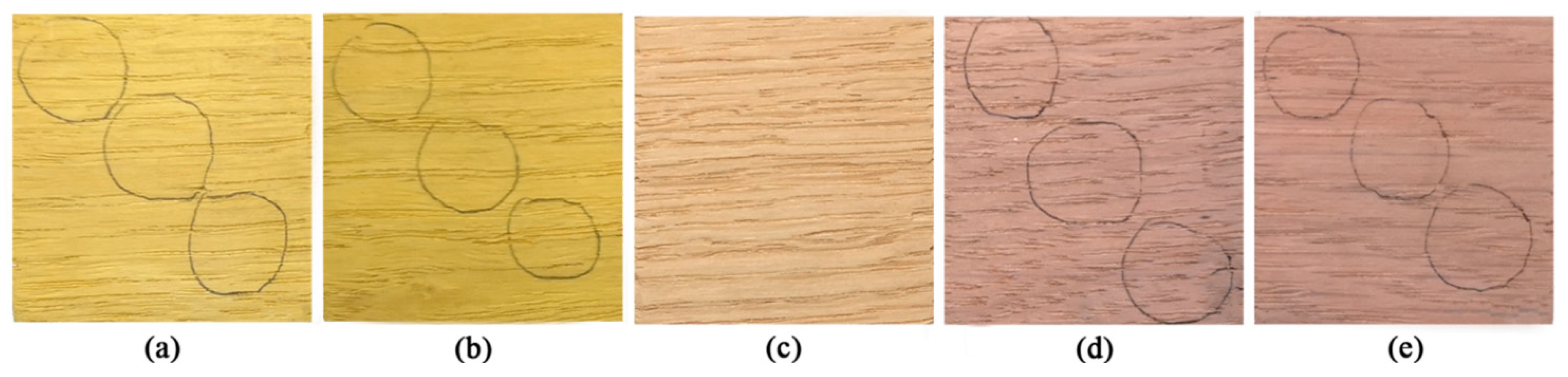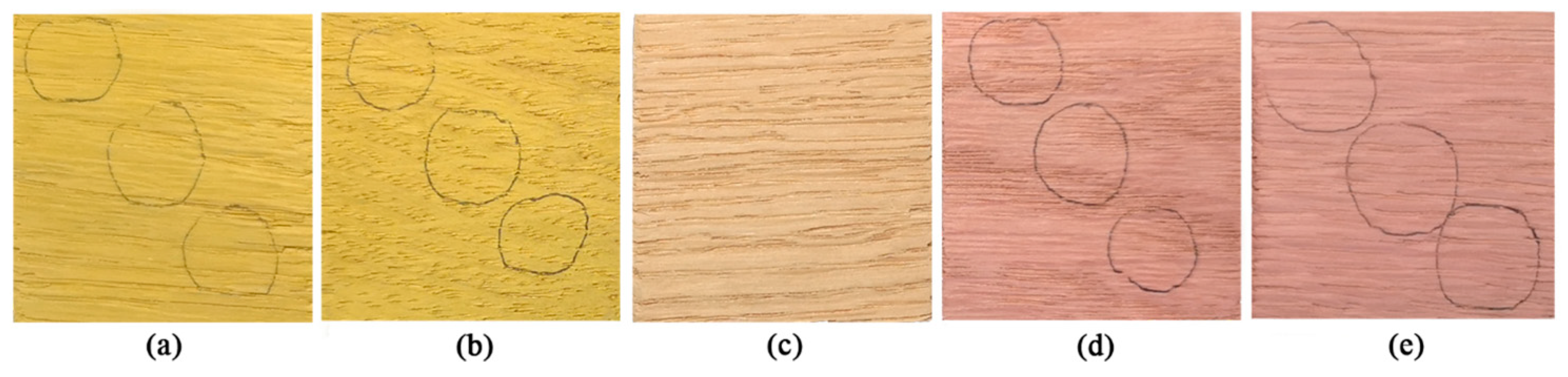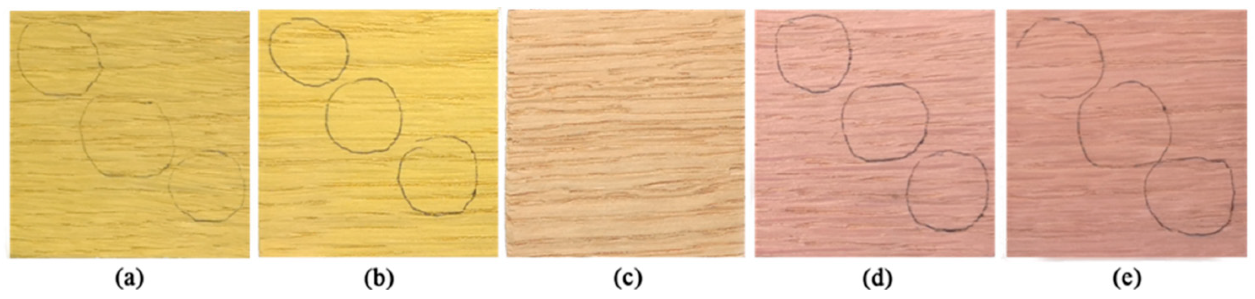 3.3. Analysis of Colorimetric Values of Stained Oak by Three Dyeing Methods