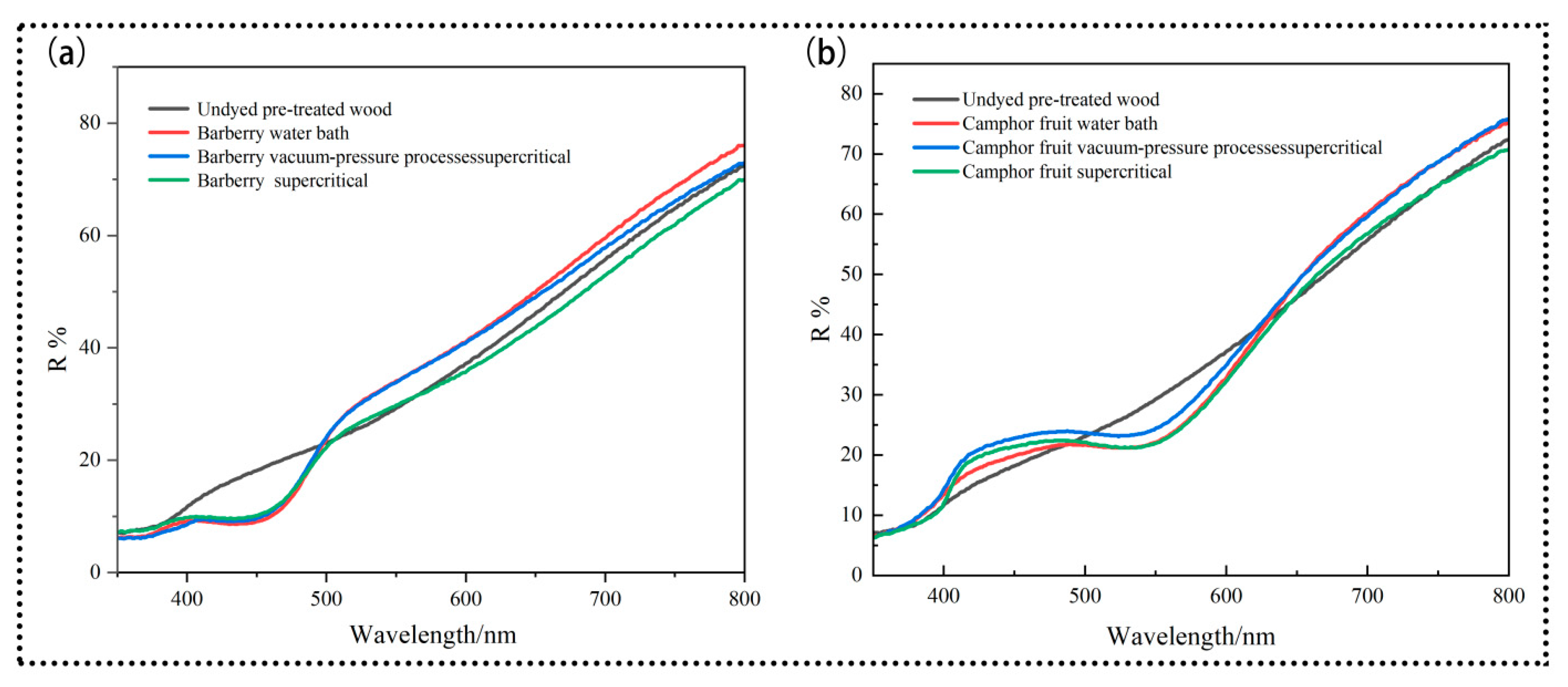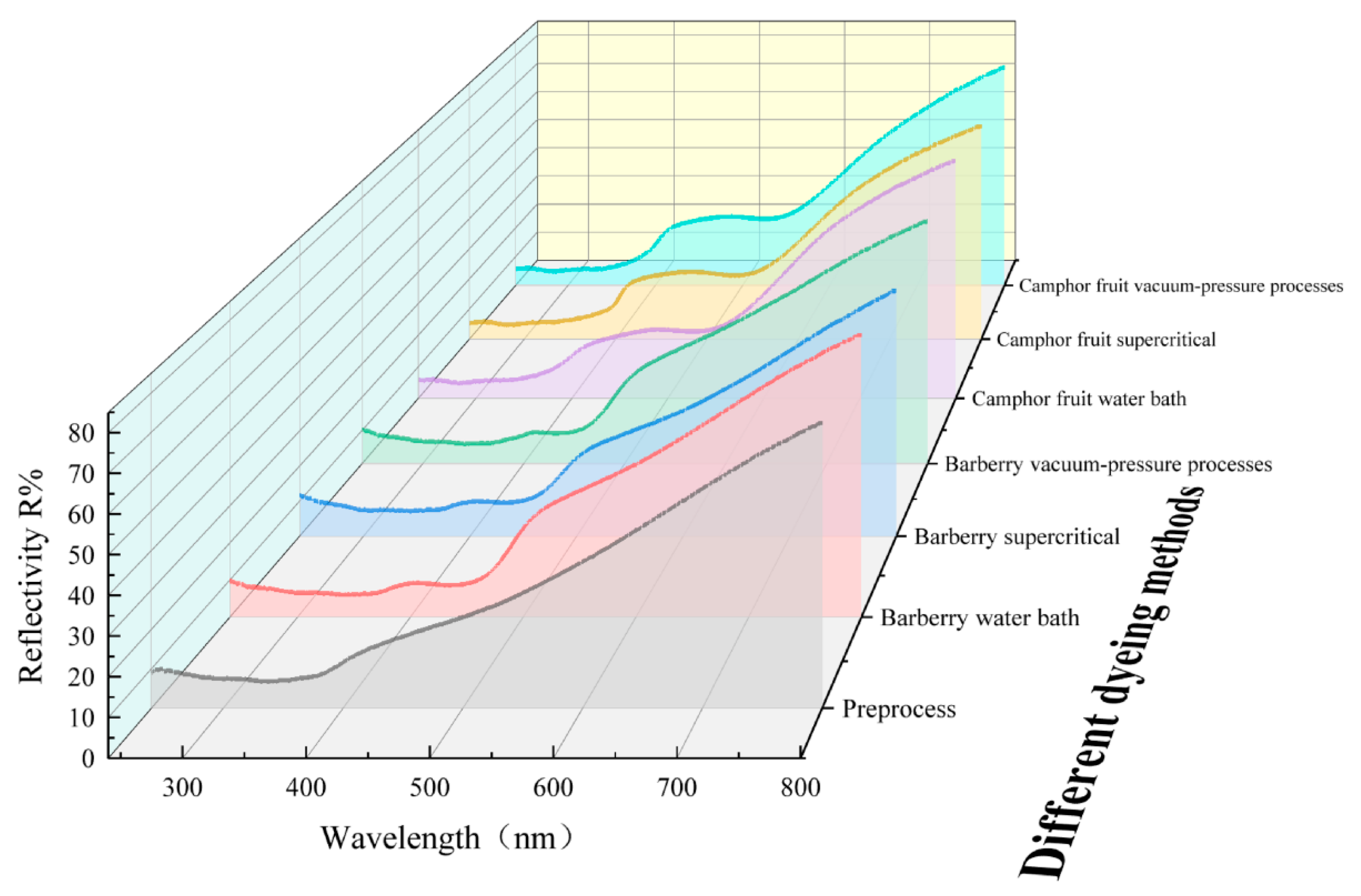 3.4. Reflectance Spectral Analysis of Dyed Oak on Three Dyeing Methods
