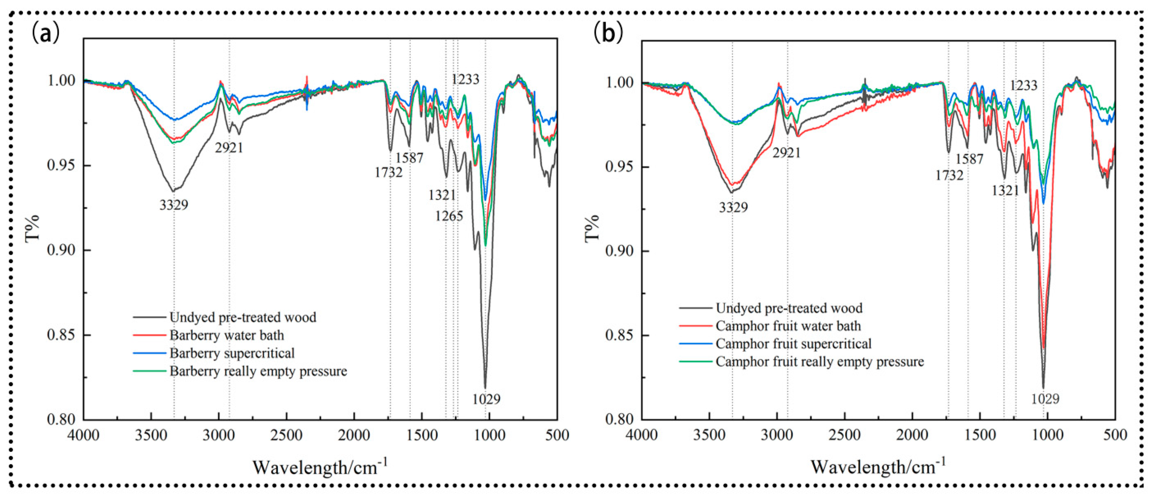 3.8. Infrared Spectral Analysis of Dyed Oak in Three Dyeing Methods