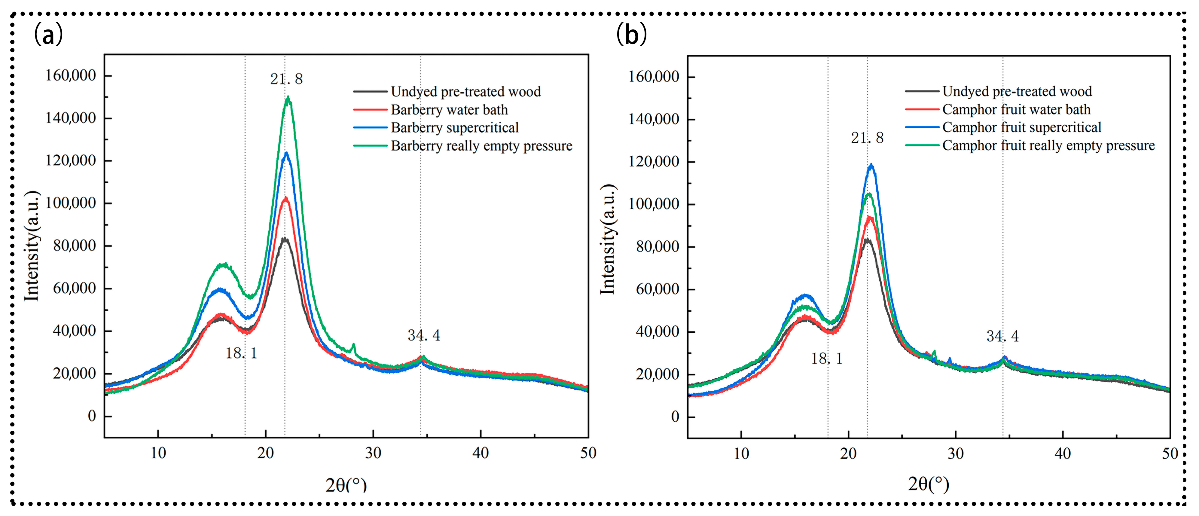 3.9. XRD Diffraction Analysis of Stained Oak by Three Staining Methods