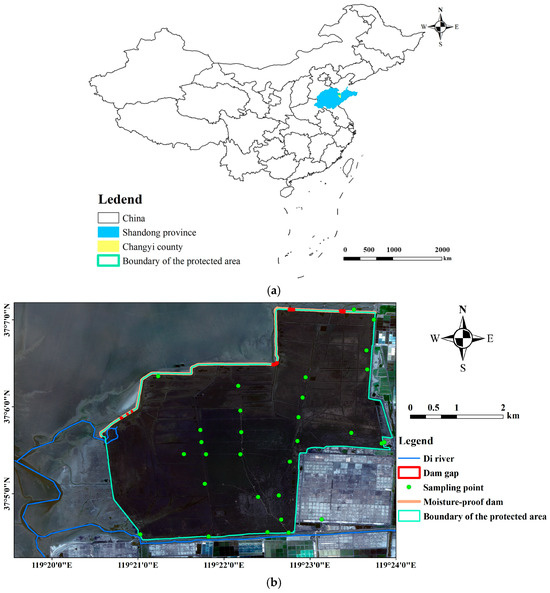 Changyi Tamarix Chinensis Forest (belonging to the Changyi National Marine Ecological Special Protection Area, hereinafter referred to as the “Protection Area”) is located on the south coast of Laizhou Bay in the Bohai Sea, China. The total area of the protection area is 2929 hectares, with a Tamarix forest area of 1548 hectares. It is the only national marine ecological special protection area in China that mainly protects Tamarix [18,21]. Therefore, the area covered by Tamarix forest with regional characteristics and representativeness in the reserve is taken as the study area. The geographical locations of the study area and sampling points are shown in Figure 1a and Figure 1b, respectively.