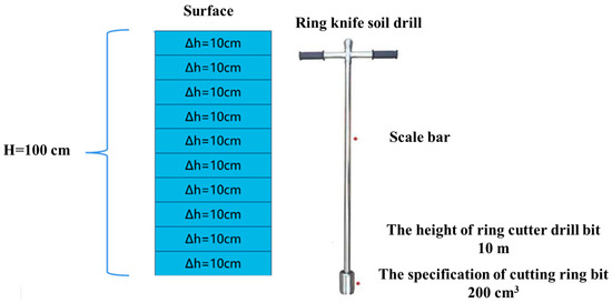 This study used a ring cutter drill to collect samples of soil from 0 to 100 cm at each sampling point. Each sampling point collected a sample every 10 cm from the surface downwards, and a total of 10 soil samples were taken, named D1–D10. This study collected a total of 293 soil samples, including 256 within the protected area and 37 outside the protected area. The sampling diagram and sampling equipment are shown in Figure 2.