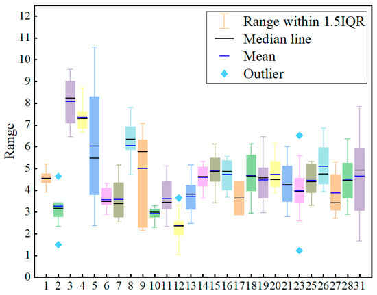 Further analysis of Figure 3 reveals that the median and mean lines of sampling points 1, 12, 15, 17, 18, 21, and 28 are relatively close, indicating that the SOC content of these points varies slightly. For these sampling points, the SOC data may follow a relatively symmetric distribution. In a symmetric distribution, the mean and median tend to be close to each other. Additionally, the environmental conditions at these points might be relatively homogeneous. For example, similar vegetation cover, soil types, and levels of human disturbance could result in a more consistent SOC accumulation and decomposition processes, leading to less variation in SOC content [33,34]. The significant difference between the median and mean lines of sampling points 5, 8, 9, 20, and 31 indicates great variation in SOC content at these points. Due to the mean value being susceptible to extreme values, when there are extreme values (abnormally high or low values) in the dataset, the mean will be pulled towards these extreme values. The median is the value located in the middle position after sorting the data from small to large, and it is not affected by extreme values. Furthermore, the difference between median and mean can reflect the skewness of data distribution. For sampling points 8, 9, 20, and 31, the significant difference between median and mean indicates that the SOC data distribution has obvious skewness. The data is not uniformly or symmetrically distributed, and there are cases where some values deviate greatly from most values.