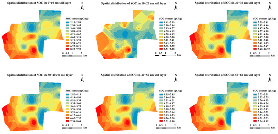 In addition, the spatial distribution of SOC variation trend with depth at each sampling point in the study area is shown in Figure 6.