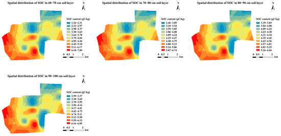 Horizontal spatial distribution map of SOC content in each soil layer from 0 to 100 cm in the protected area.