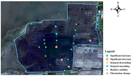 - The area of the fluctuation change trend area accounts for the largest area of the protection area (the number of corresponding points of the fluctuation change trend accounts for 74.07% of the total number of sampling points), which appears in some areas in the south, west, northwest, and central northeast of the protection area, such as the surrounding areas corresponding to the sampling points of 1, 2, 3, 9, 14, 16, 19 and 21 in the protection area. The SOC content in these areas shows an obvious fluctuation with depth, which is similar to the wave shape. This may be related to the interaction of various factors such as soil bedding structure, seasonal variation, tidal action and salinity change [48,49,50].