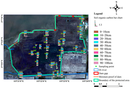 In order to analyze the vertical spatial distribution characteristics of SOC in the study area more clearly, based on factors such as land cover type, ecological function, and geographical location, this study divides the study area into “core area of Chinese Tamarix forest and high-density Tamarix forest area”, “core area of Tamarix forest and medium-density Tamarix forest area”, “northeast ecological restoration area and low-density Tamarix forest area”, “southeast inland area and medium-density Tamarix forest area”, “area affected by seawater backflow and high-density Tamarix forest area”, “area affected by seawater backflow and medium-density Tamarix forest area”, “moisture-proof dam protection area and low-density Tamarix forest area”, and “Di River influencing area”: a total of eight zones [51]. The vertical variation and spatial distribution of SOC content at each sampling point in the study area are shown in Figure 7.