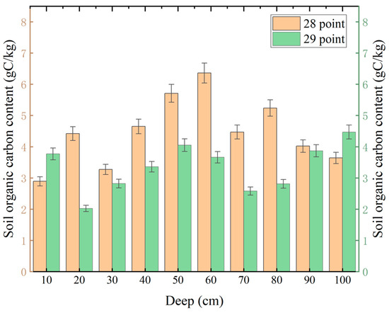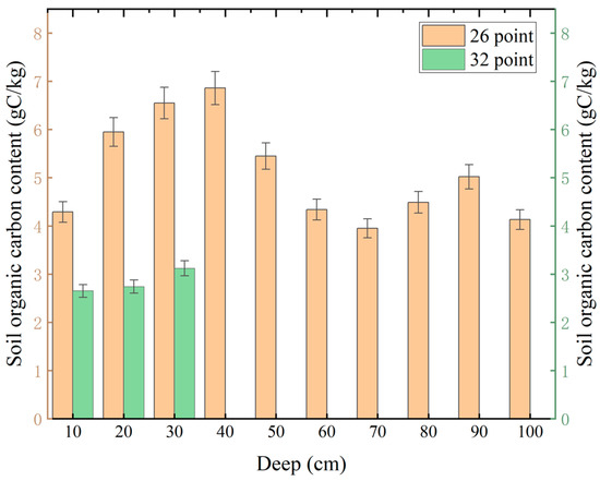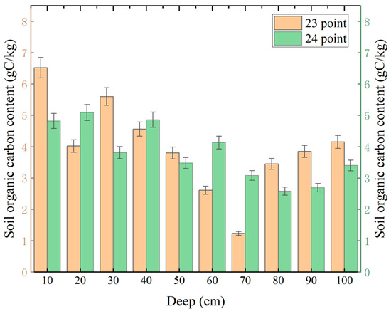 In the context of the implementation of ecological restoration engineering measures, from the distribution of SOC content at each sampling point in Figure 8, it can be observed that the SOC content of the upper soil (0–50 cm) at points 20, 21, 25, and 26 increases with increasing soil depth and reaches the peak at 50 cm. The reason is that the artificial planting of Tamarix increases the vegetation coverage in the region, providing abundant organic matter input to the upper soil and increasing the SOC content. However, compared with point 5 in the core area of the Tamarix forest, there is still much room for improvement in terms of vegetation coverage. By further increasing vegetation coverage, the SOC content in individual areas of the reserve can be further improved, thereby enhancing the carbon storage capacity of the reserve. This not only helps to improve soil fertility and productivity but also plays an important role in combating climate change.