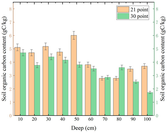 In order to better analyze the overall spatial distribution characteristics of SOC content in the study area, this study systematically analyzed the distribution and characteristics of SOC content at each sampling point by calculating the SOC mean value (SOC sum value at each sampling point/soil layer number at each sampling point).