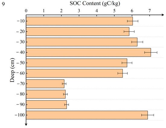 - The overall growth trend area appears in the north–central region of the reserve, such as sampling point 10. The SOC content in this area fluctuates at different depths, but the overall trend is an increasing one. This study concludes that this phenomenon may also be caused by tidal phenomena, storm surges, moisture-proof dams, vegetation coverage, and other factors. However, the point is at a distance of 977 m from the coast and the vegetation coverage less than point 8.