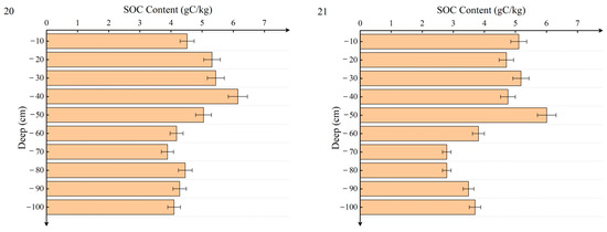 Figure 3 shows a box line diagram of the SOC content in the range of 0–100 cm depth at 27 sampling points in the study area. Analysis of Figure 3 reveals that the SOC content in the study area is roughly distributed within the range of 1.0–10.0 gC/kg, with the mean value is distributed in the range of 2.5–8.2 gC/kg. According to the statistical data on the dynamic changes in soil organic carbon in China from 2001 to 2020, the average SOC content at depths of 0–100 cm from 2001 to 2020 was 9.3 gC/kg, slightly higher than the average SOC content in this study area [28]. Some of the sampling points have relatively high box sizes, such as sampling points 5 and 31, indicating that the SOC content of these sampling points varies greatly. The first and tenth sampling points have relatively low box heights, indicating that their SOC content changes relatively little [29,30].