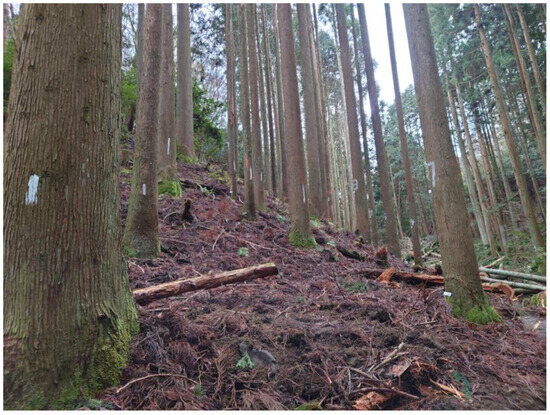 The study site is a privately owned forest in Wazuka Town, Kyoto Prefecture, Japan. The site is a 45-65-year-old Japanese cedar plantation with approximately 350 trees/ha. Since there is no record of thinning history, the intensity and timing of the thinning are unknown. However, poor-quality standing trees are selectively harvested during commercial thinning. As is common in many Japanese forests, detailed management records, such as cultivar and planting density, were unavailable (Figure 1). The elevation of the site is 435 m. From 2015 to 2024, the 10 y average climatic conditions were as follows: a maximum temperature of 38.7 °C, a minimum temperature of −2.5 °C, and a total annual precipitation of 1661.7 mm [25]. The target species of this study, Cryptomeria japonica (Japanese cedar), is a major coniferous species in Japan. Large-scale afforestation of this species was actively promoted in the 1950s [26], particularly in valleys and on gentle slopes with favorable moisture conditions. Currently, cedar accounts for approximately 60% of Japan’s domestic log production [27] and plays a vital role in national timber supply. However, due to the considerable variability in wood quality [7], its use as structural timber remains limited, and many of the structural materials used in Japan are made from foreign species.