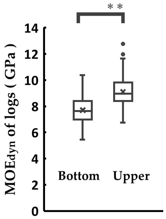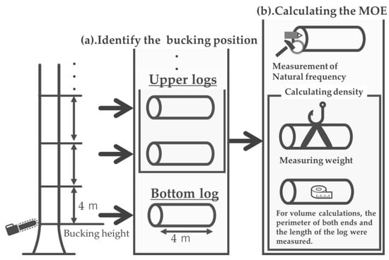 With growing concerns about global warming, the demand for larger and high-rise wooden buildings is increasing as a means of carbon fixation [1]. The mechanical properties of wood, such as strength, are important when it is used as a structural material, and it is required in Japan to clearly demonstrate its strength performance [2]. Therefore, the dynamic modulus of elasticity (), which correlates with strength and can be measured non-destructively, is used as an indicator of strength performance in Japan [3]. However, since logs are delivered to the sawmill without prior quality assessment, the sawmill must purchase more logs than required when a certain quantity of logs with high for structural use is needed. As a result, many low-quality logs are processed, and the wood processing industry bears the associated costs [4]. Thus, the selection of logs with high or trees with high potential for producing high- logs should improve the efficiency of securing raw materials for log distribution. When logs that meet the quality requirements of sawmills can be secured, they are typically assigned higher prices than usual [5,6]. In addition, Cryptomeria japonica (Japanese cedar) exhibits high variability in strength performance and is generally classified as a species with a low [7]. Therefore, if it is possible to identify standing trees that produce logs with a high , such trees of guaranteed quality can be preferentially harvested and sold at higher prices. By determining the of logs in advance, harvesting and sales can be strategically planned to achieve greater efficiency and profitability in log trading.