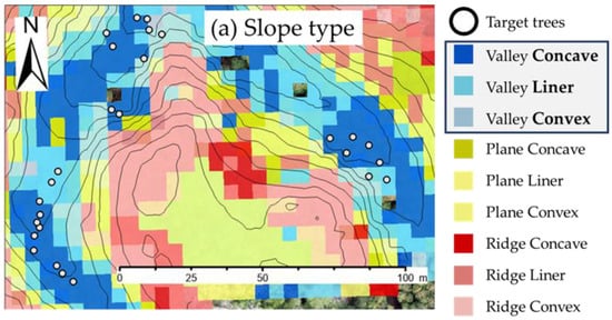 In the current study, the slope type was defined based on topographic variation (Figure 3), and a classification of nine slope types was created using GIS, combining profile and plan curvatures [32] (e.g., concave, linear, and convex in valley, linear, and ridge areas). At the study site, cedar was planted only in the valleys and was therefore classified into three slope types: concave, linear, and convex within the valley areas (Figure 3a). Soil deposition was defined as the depositional type. Following the classification method proposed by Teraoka et al. [23], the slope type was categorized into three classes based on the gradient: steep and moderate slopes were classified as creep soil (creep), whereas gentle slopes were further divided into colluvial (concave or linear) and residual (convex) types (Figure 3b).