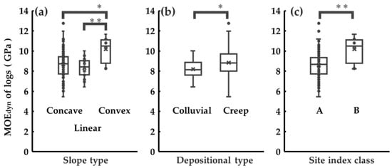 Differences in by site conditions: (a) relationship between slope type and of logs; (b) relationship between depositional type and of logs; (c) relationship between site index class and of logs. Asterisks indicate statistical significance: * p < 0.05, ** p < 0.01.